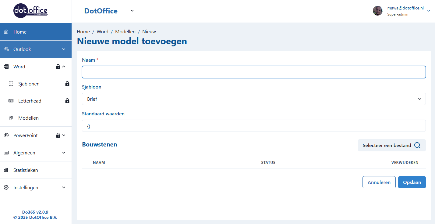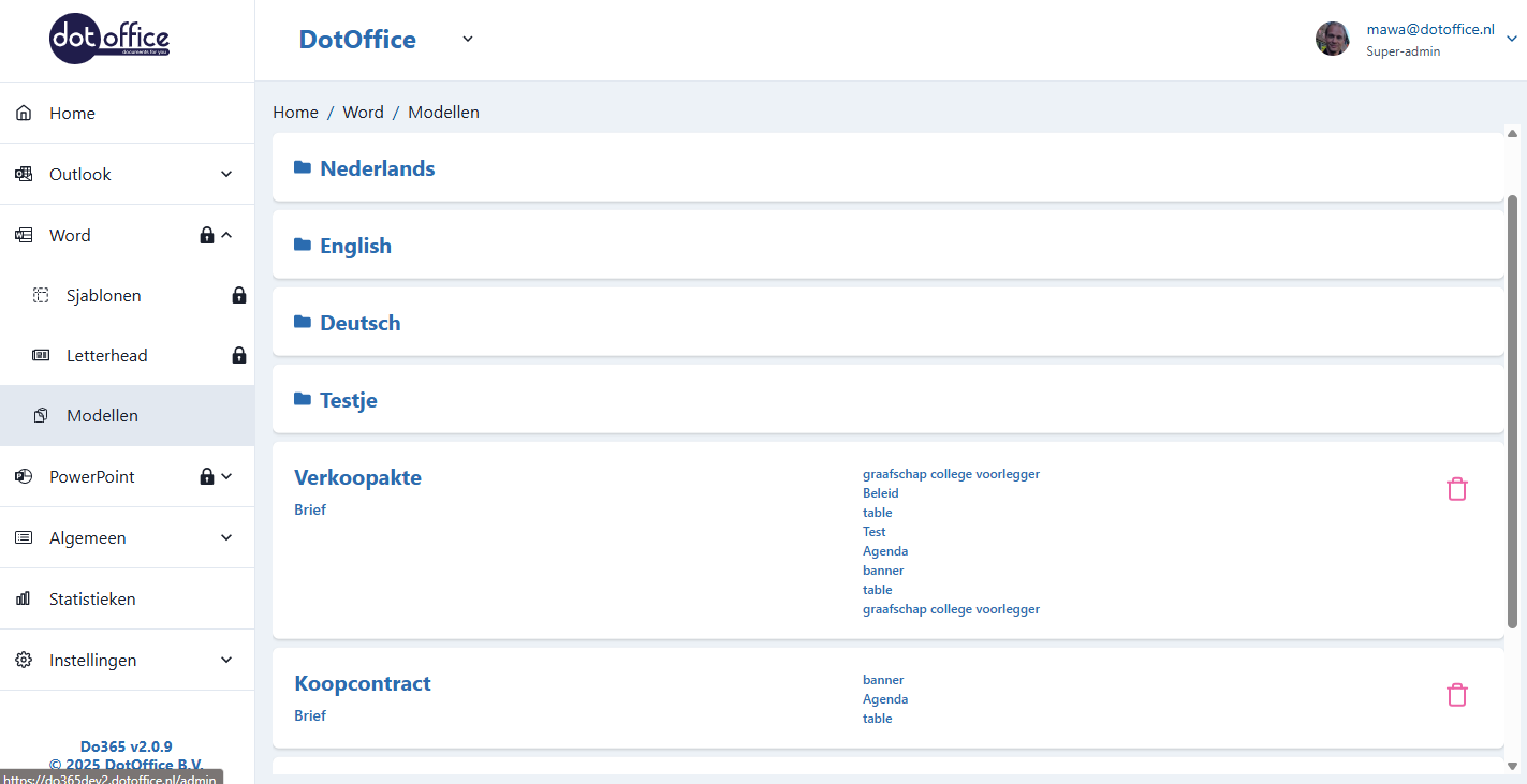 U kunt modellen maken in do365 door in de admin omgeving naar Word - Modellen te gaan.