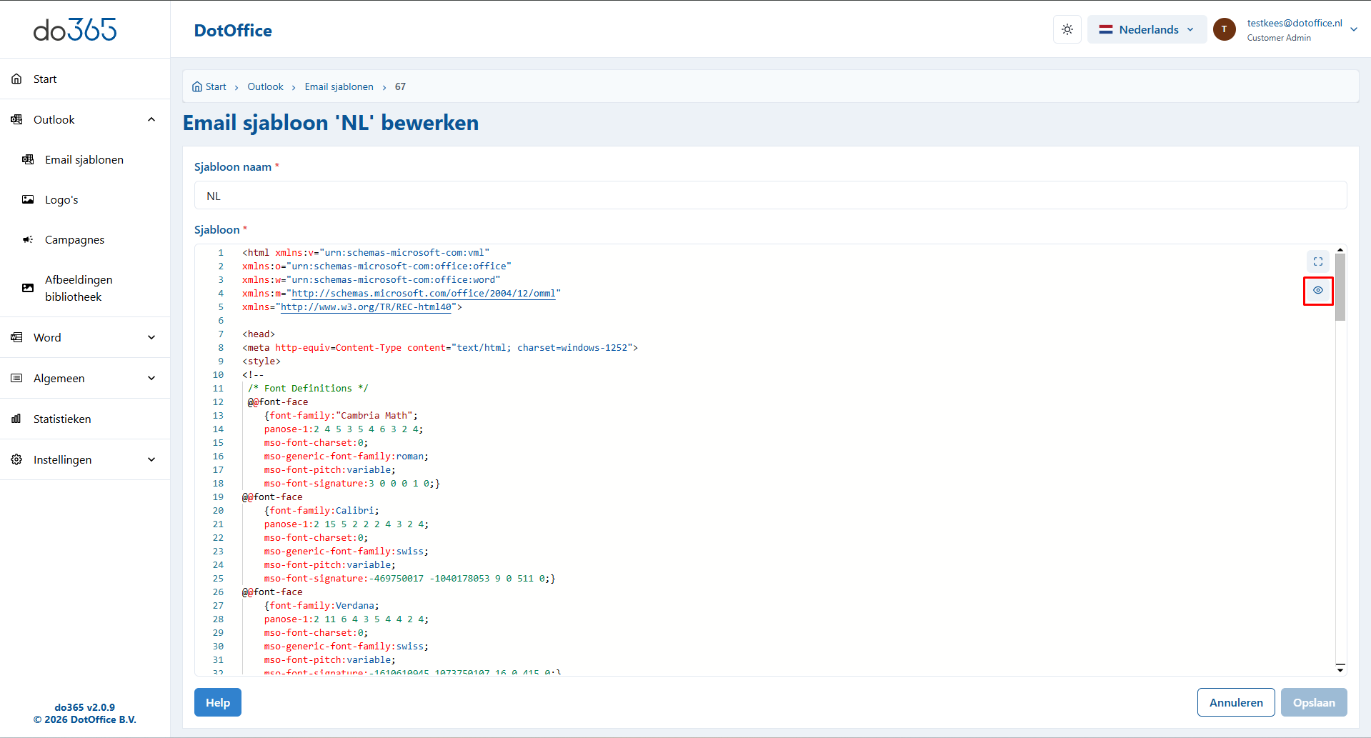 U komt terecht in de edit-html-weergave, waar u op het oogje kunt klikken om een preview van uw creatie te zien