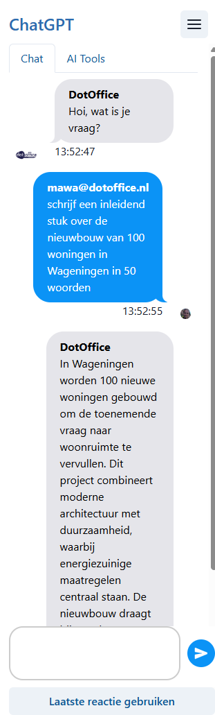 U kunt tijdens het samenstellen van een document hulp vragen aan ChatGPT. Zodra het resultaat in het chatvenster is zoals u het hebben wilt, drukt u op de knop "Laatste reactie invoegen" Deze optie is te gebruiken in combinatie met een api-key die uw organisatie moet aanvragen bij ChatGPT.