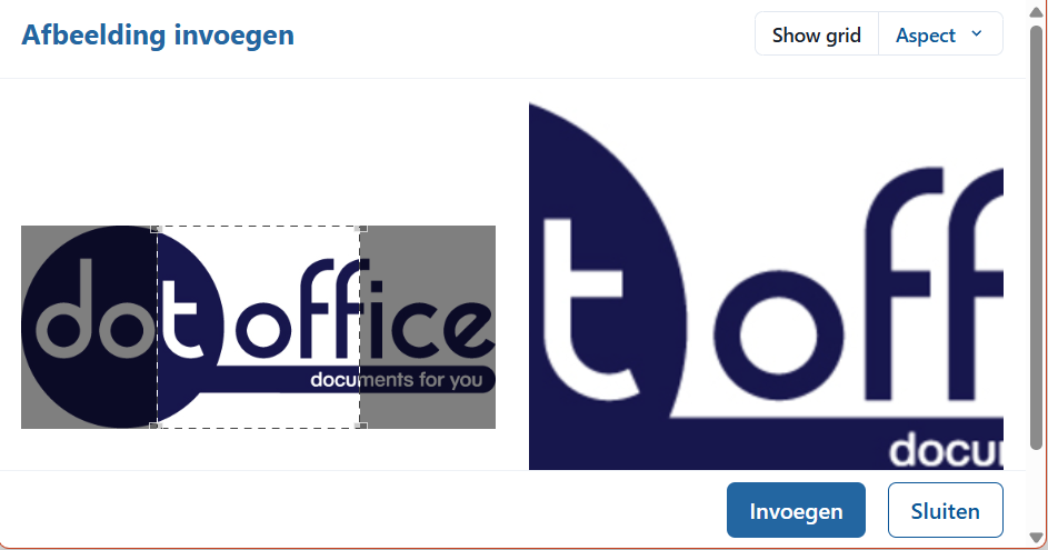 Als u op bladeren klikt kunt u zelf een afbeelding kiezen deze aanpassen qua formaat en vervolgens invoegen.